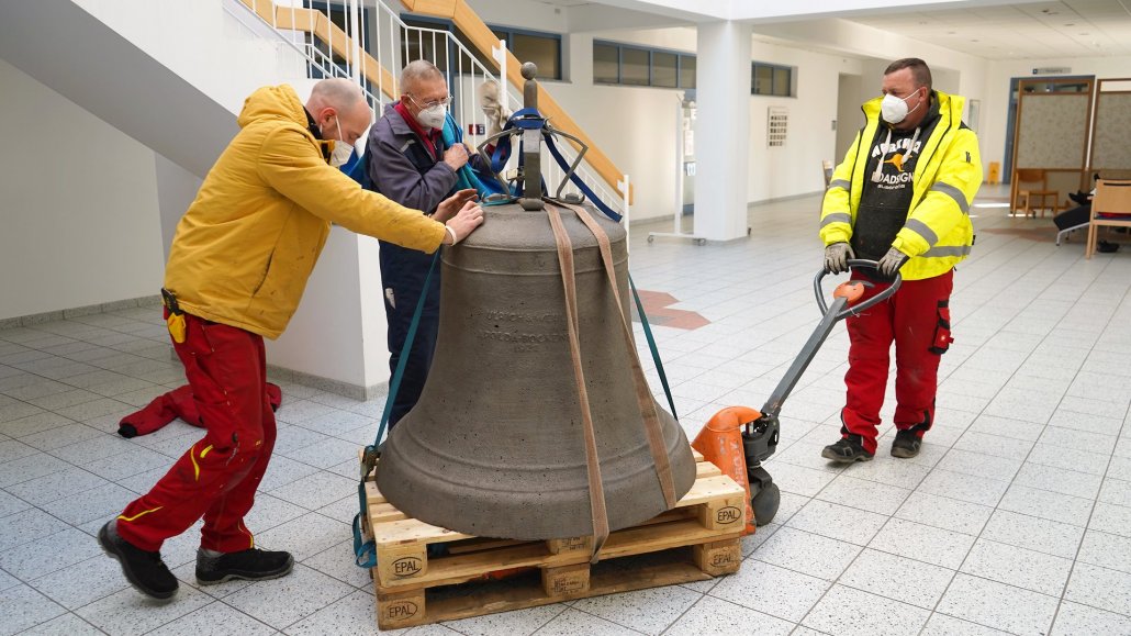 Gemeinsam mit den Technikern der HERSCURO KLINIKEN gelang es schließlich, die Glocke auf einer Europapalette zu platzieren und für den Transport zu sichern. (Foto: Kathrin Kupka-Hahn)