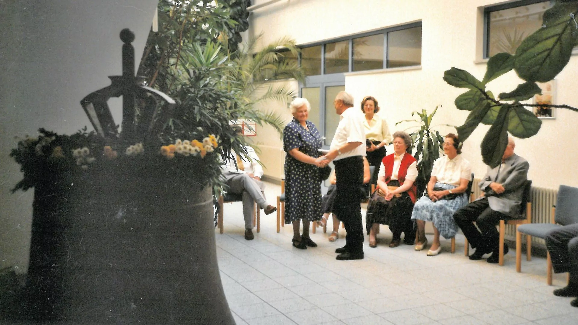 Margareta Albert, die in den HESCURO KLINIKEN schon seit über 40 Jahren im Bereich Gästemanagement tätig ist, erinnert sich: "Marianne Hoffmann-Fritsch war eine im Glauben tief verwurzelte Frau." Die Glocke widmete sie dem Gedenken an ihren Mann Hans Fritsch, der die Bad Bockleter Kurklinik von 1974 bis zu seinem Tod im Jahr 1997 leitete. "Die Einweihung in der Klinik nahm am 10. Juli 2001 der damalige Pfarrer Hans Turn vor", erzählt Margareta Albert. Mit von der Partie waren unter anderem Thurns Vorgänger Pfarrer Ammersbach sowie Pfarrer Markart und Pfarrer Uhl. Die Glocke trug einen Blumenkranz, es gab Musik und anschließend noch einen Empfang. Fotos aus dem Archiv von Margareta Albert belegen die Ereignisse.