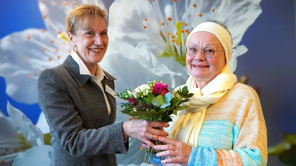 Andrea Erhard (links) vom Gästemanagement der HESCURO KLINIK Bad Bocklet überreicht Christa Herwig für ihre Treue zur Klinik einen Blumenstrauß.