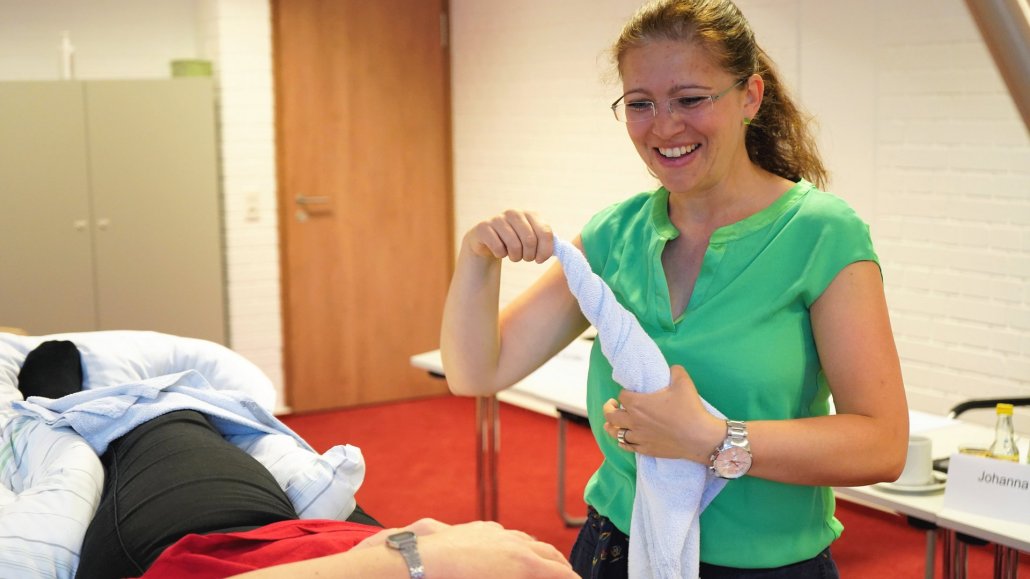 "Diese praktischen Anleitungen und Informationen sind für die pflegenden Angehörigen sehr wichtig", weiß Jessica Walter, die mehr als 15 Jahre Berufserfahrung als Gesundheits- und Krankenpflegerin hat. "Pflegende Angehörige haben oftmals keine pflegerische Ausbildung. Hinzu kommt, dass sie eine natürliche Hemmschwelle haben, jemanden aus dem privaten Umfeld anzufassen." Genau da setzt die Pflegedienstleiterin an. In ihren Kurseinheiten vermittelt sie in erster Linie Wissen und Methoden aus dem Bobath-Konzept, aus "Kinästhetik in der Pflege" oder nach dem LiN-Kozept (Lagerung in Neutralstellung). Daneben möchte sie den Teilnehmenden Sicherheit und die Zuversicht zu geben, dass sie in ihre Aufgaben hineinwachsen werden. "Ich lasse sie in den Kursen selbst in die Rolle des zu Pflegenden schlüpfen. Damit sie spüren, wie sich diese bei verschiedenen Pflegetätigkeiten fühlen."