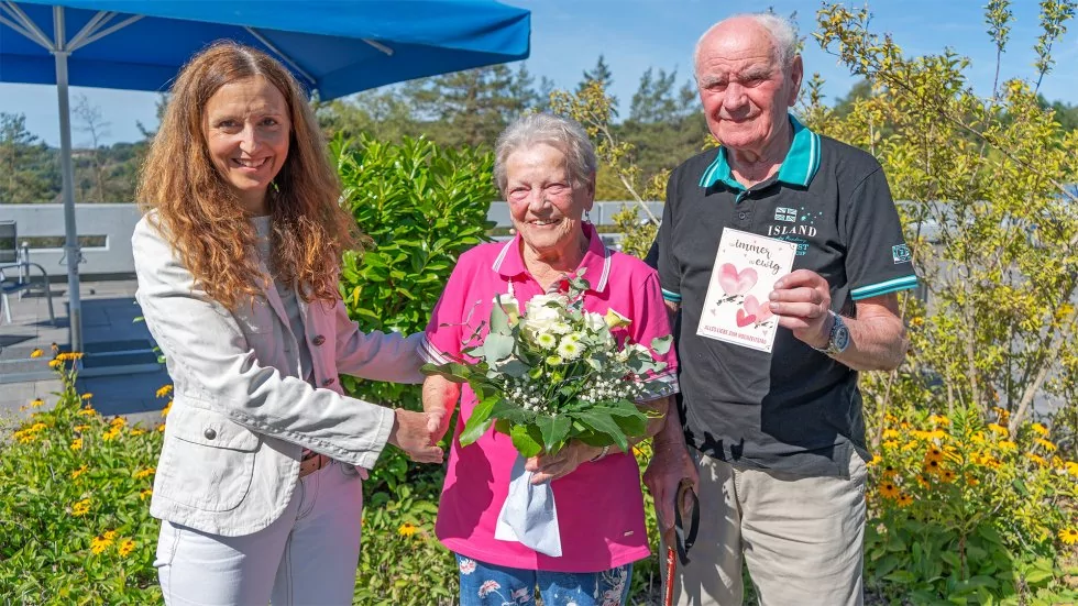 Dr. Antje Geier, Kaufmännische Leiterin der HESCURO KLNIK Bad Bocklet, gratuliert Hildegund und Gregor Heinrich zum 67. Hochzeitstag
