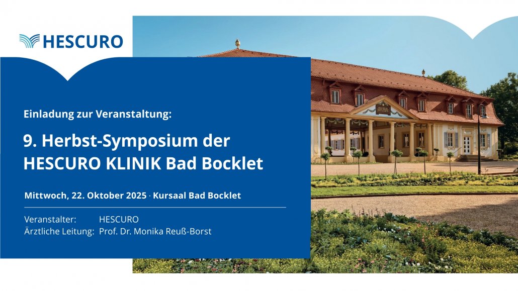 „Häufige Erkrankungen in Klinik und Praxis“ stehen im Mittelpunkt des diesjährigen Ärzte-Symposiums der HESCURO KLINIK Bad Bocklet. Die Fortbildungsveranstaltung findet am Mittwoch, 22. Oktober 2025, ab 15:30 Uhr im Kursaal Bad Bocklet statt und richtet sich gleichermaßen an niedergelassene wie an Klinikärzte.