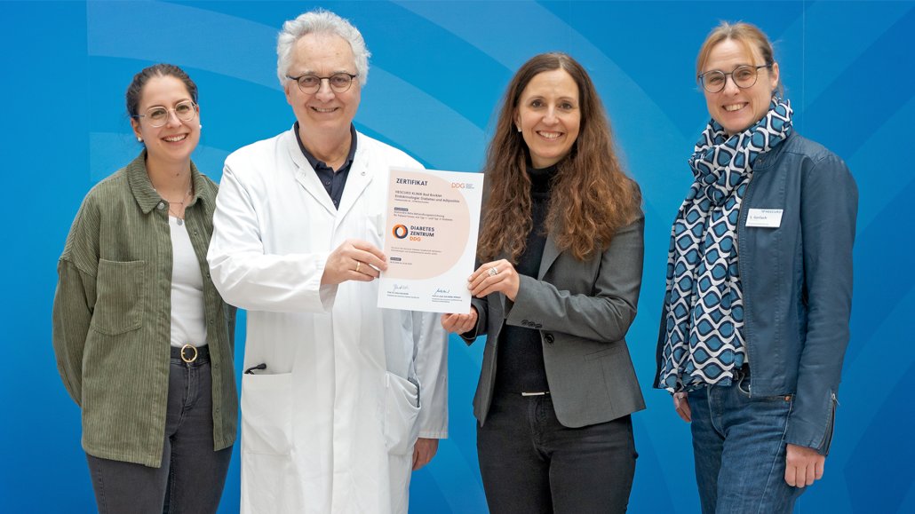 Die Deutsche Diabetes Gesellschaft (DDG) hat die HESCURO KLINIK Bad Bocklet erneut als "Diabeteszentrum DDG" zertifiziert. Für den Erhalt des Zertifikats galt es, einer ganzen Reihe von Kriterien Rechnung zu tragen. Dazu zählen die hohe Qualifikation der Mitarbeitenden, das Erfüllen zahlreicher diabetesspezifischer Leistungsmerkmale sowie ein klar definiertes Behandlungs- und Überweisungsmanagement.