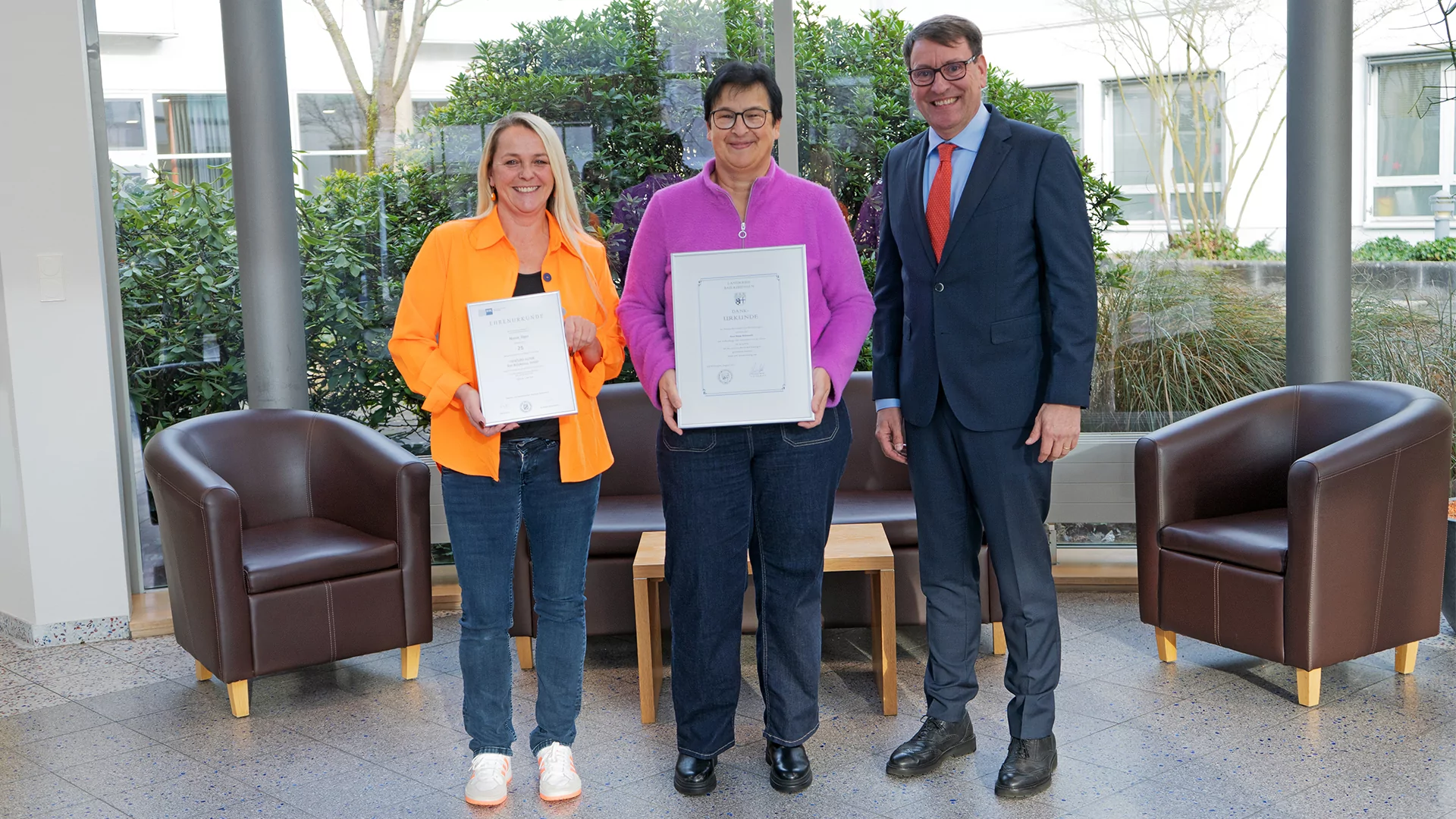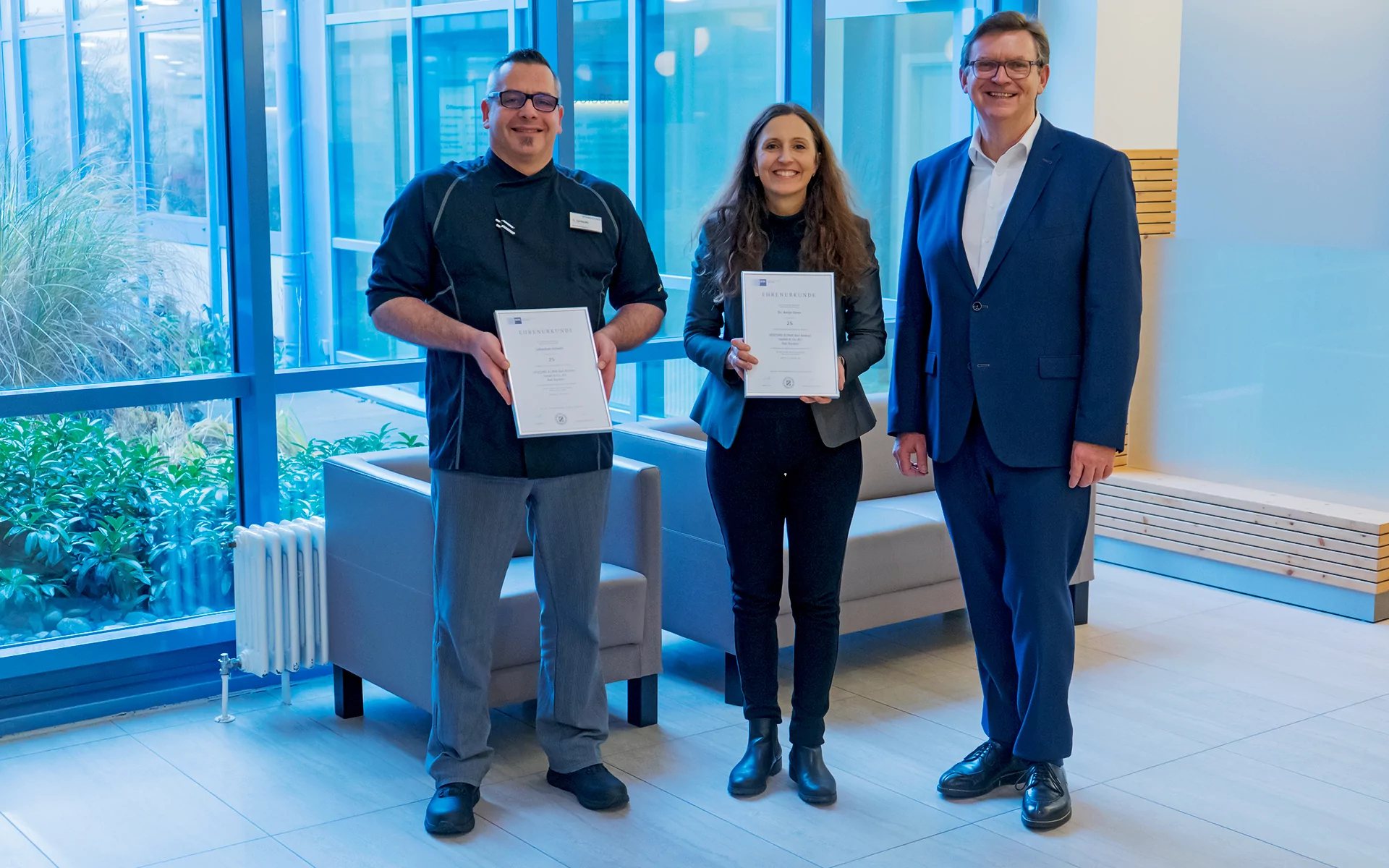 Kliniken Bad Bocklet AG und HESCURO KLINIK Bad Bocklet, v.l.: Sebastian Gröschl und Dr. Antje Geier (beide 25 Jahre und mit Ehrenurkunde der IHK Würzburg-Schweinfurt); Stephan Greb (Vorstand Unternehmensgruppe HESCURO)