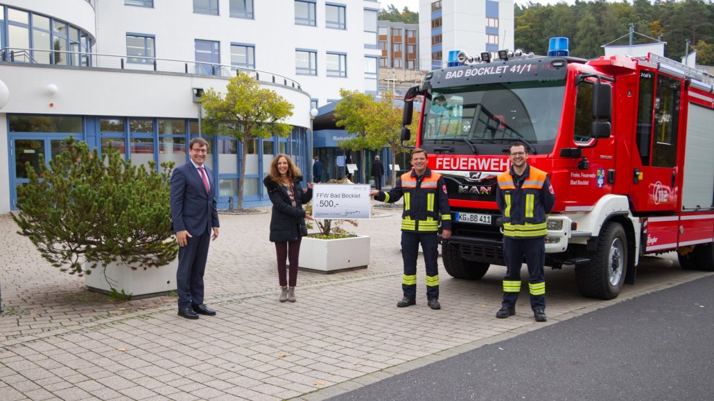 Am 14.10.2021 überreichten Alexander Zugsbradl, Vorstand, und Dr. Antje Geier, Kaufmännische Leiterin der Kliniken Bad Bocklet AG, den symbolischen Spendenscheck in Höhe von 500 Euro an den 1. Kommandant der Freiwilligen Feuerwehr Bad Bocklet, Christian Horn. Er sagt: „Recht herzlichen Dank im Namen der Feuerwehr Bad Bocklet, für die gute Zusammenarbeit und die großzügige Spende. Wir werden mit dem Geld einen neuen Fahrradständer beschaffen, da immer mehr Einsatzkräfte mit dem Fahrrad oder E-Bike zum Feuerwehrgerätehaus kommen, und somit eine optimale Abstellmöglichkeit geschaffen wird“.