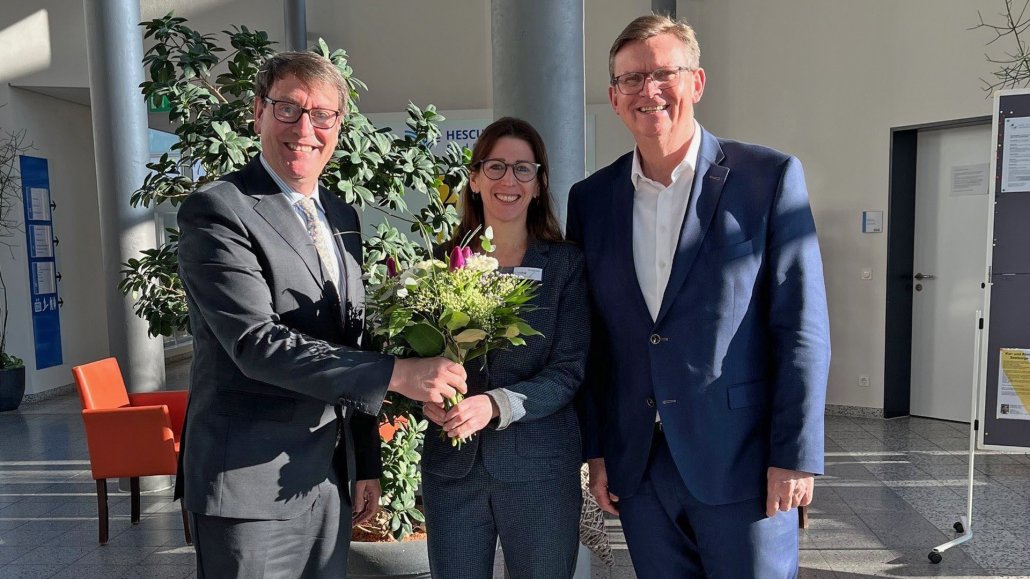 Alexander Zugsbradl (Geschäftsführer HESCURO KLINIK Bad Brückenau, l.) und Stephan Greb (Geschäftsführer HESCURO KLINIK Bad Brückenau, r.) begrüßen Sabine Freitag (Mitte) zum Start als Kaufmännische Leiterin der HESCURO KLINIK Bad Brückenau.