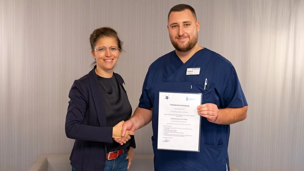 Seit rund eineinhalb Jahren ist Kevin Bekiesch an der HESCURO KLINIK Bad Kissingen als Altenpfleger tätig. Nun hat er am Rhön-Saale Gründer- und Innovationszentrum Bad Kissingen die Weiterbildung "Praxisanleitung in der Pflege" erfolgreich abgeschlossen. Dazu gratulierte ihm Jessica Walter, Pflegedienstleiterin der HESCURO KLINIK Bad Kissingen.