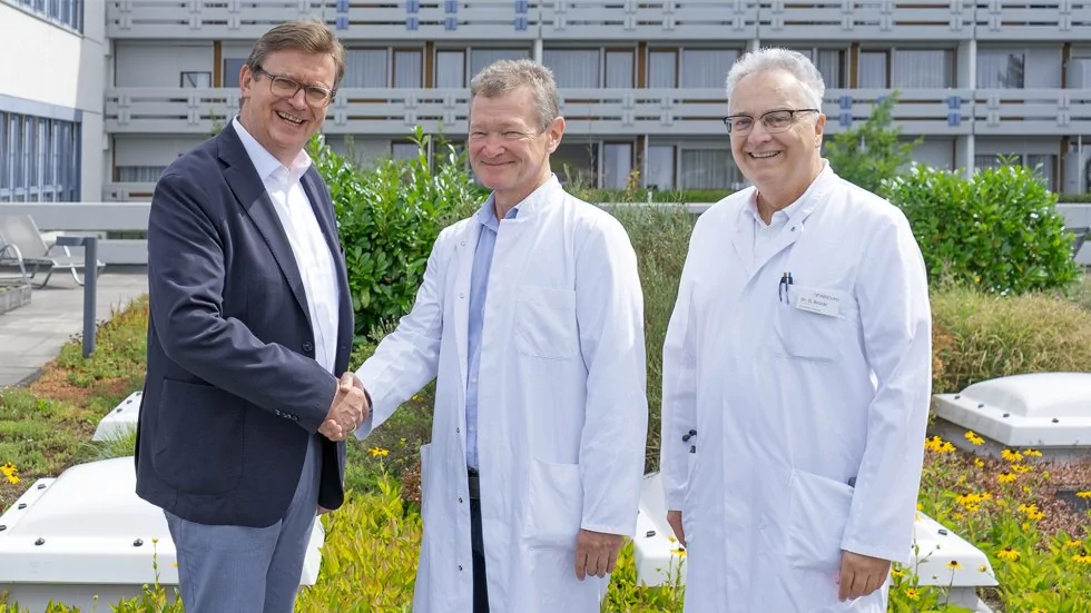 Stephan Greb (l.), Geschäftsführer der HESCURO KLINIK Bad Bocklet, und Dr. Dietmar Brückl (r.), Chefarzt der Inneren Medizin der HESCURO KLINIK Bad Bocklet, gratulieren Oberarzt Dr. Zsolt Sarnyai zur Anerkennung der Zusatzbezeichnung "Diabetologe DDG"