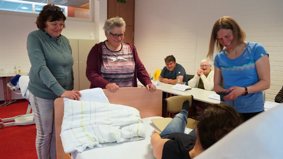 Besonders praktisch und unmittelbar umsetzbar sind die Kurseinheiten zu Transfermöglichkeiten und zu rückenschonenden Pflegetechniken. Jessica Walter zeigt den Teilnehmenden, wie sich eine zu pflegende Person mit einfachen Handgriffen im Bett repositionieren lässt – ohne, dass die pflegende Person dabei ihren eigenen Rücken überbelastet. Dass es dafür keine teuren Hilfsmittel braucht, macht Jessica Walter mit einem einfachen Beispiel deutlich: Ein gewöhnlicher Müllsack, unter die zu pflegende Person gelegt, ermöglicht das reibungsarme Verschieben im Bett - schonend für alle Beteiligten. „Ich wusste gar nicht, dass man das so einfach lösen kann", sagt ein Teilnehmer nach der Kurseinheit. „Das hätte mir zuhause schon so viel erspart."