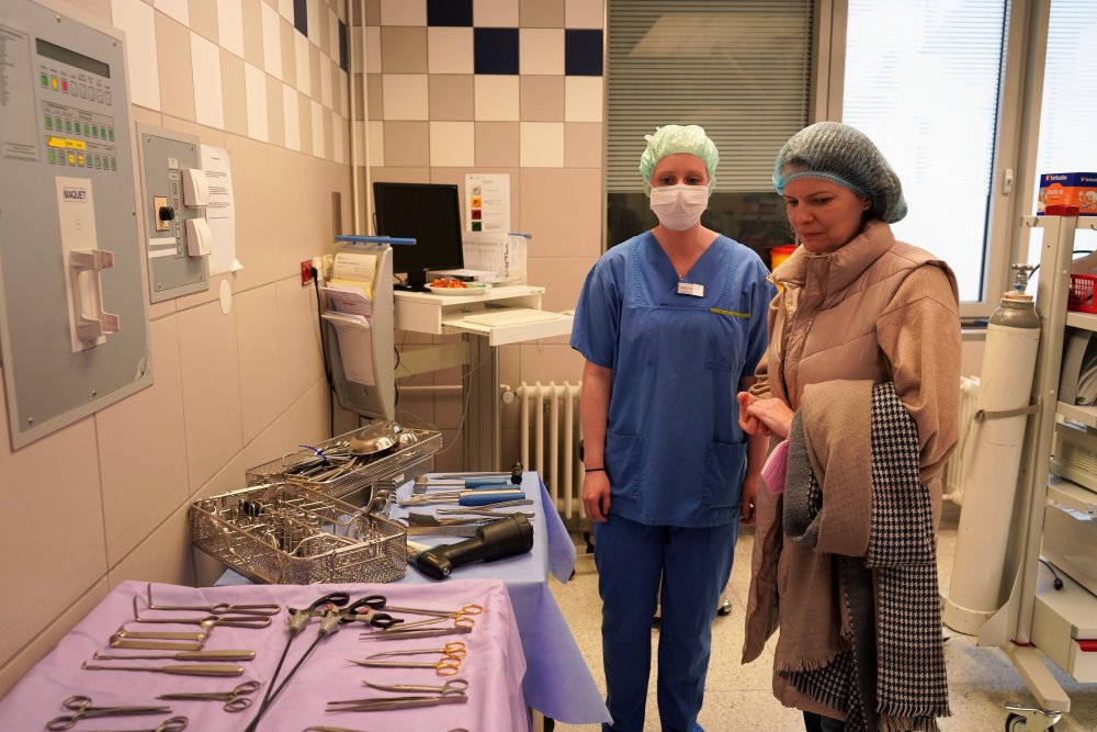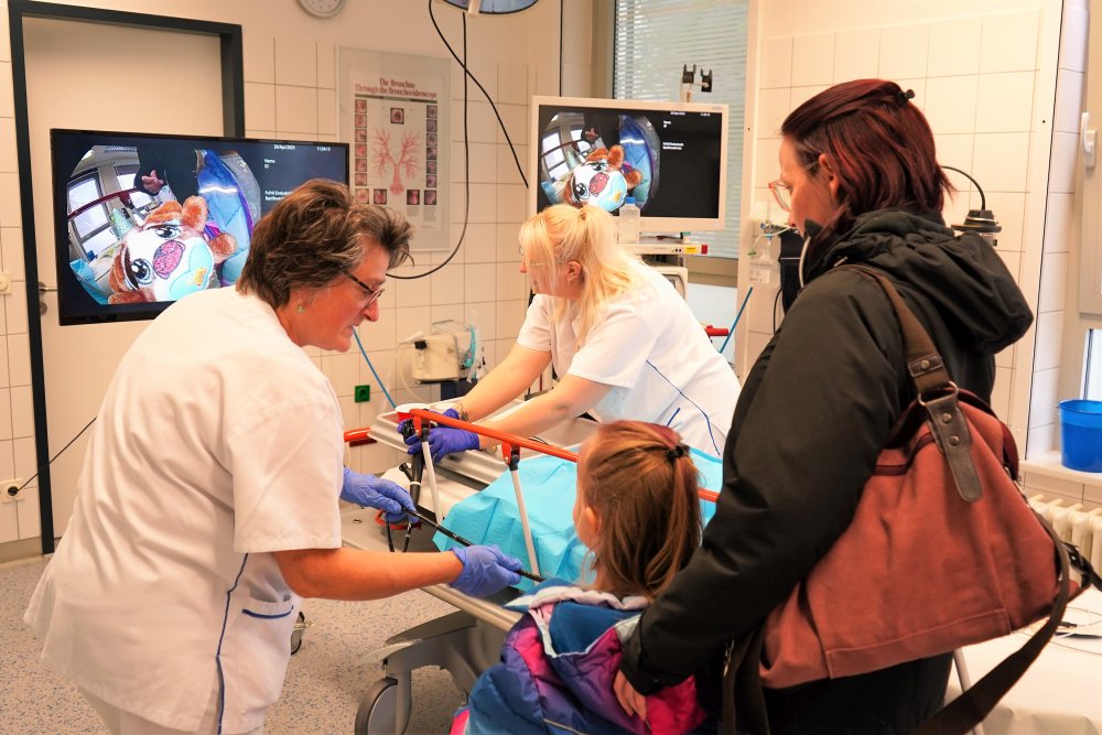 In der Abteilung Endoskopie im MVZ konnten Kinder das Innenleben ihrer Kuscheltiere anschauen. Erwachsene hingegen bekamen das Innere eines Huhnes gezeigt, welches den Namen Elfriede trug. „Die Idee, ein Hühnchen als Modell zu verwenden, ist mir abends zu Hause gekommen“, verrät die Mitarbeiterin mit einem Schmunzeln. Denn normalerweise werden mit dem biegsamen Beobachtungsschlauch, dem Endoskop, die inneren Organe des Menschen wie Magen oder Darm untersucht und veranschaulicht.