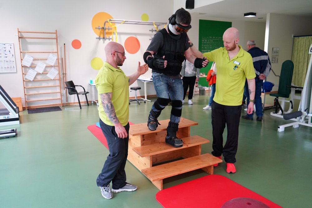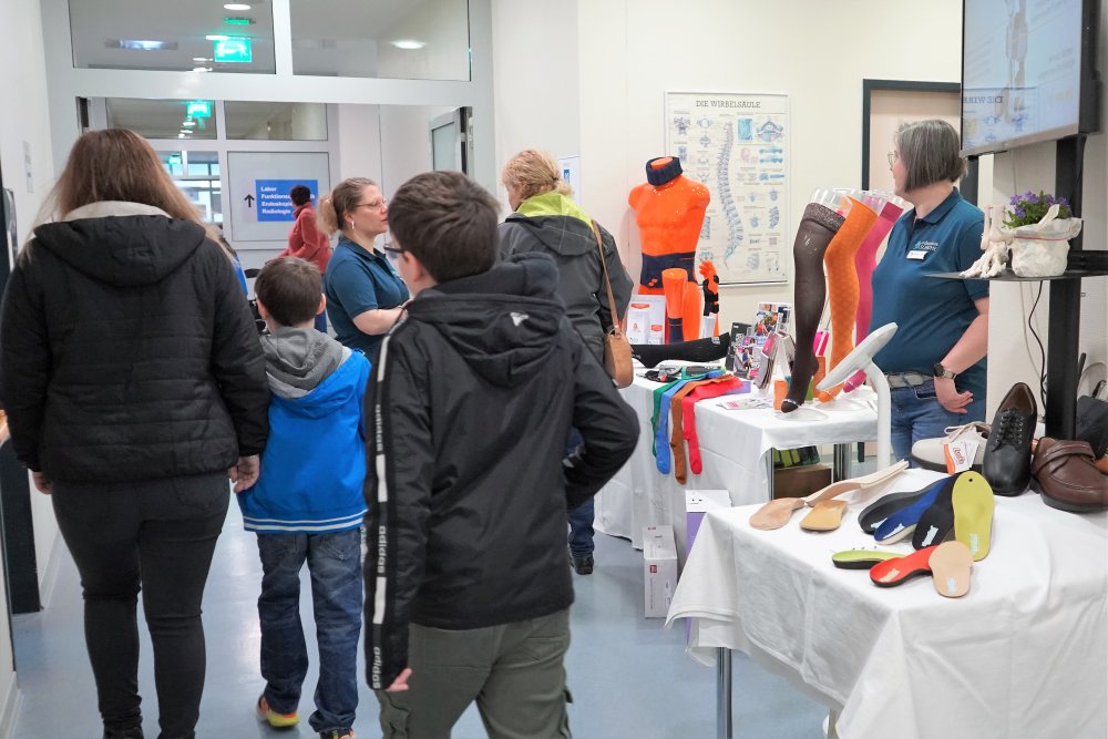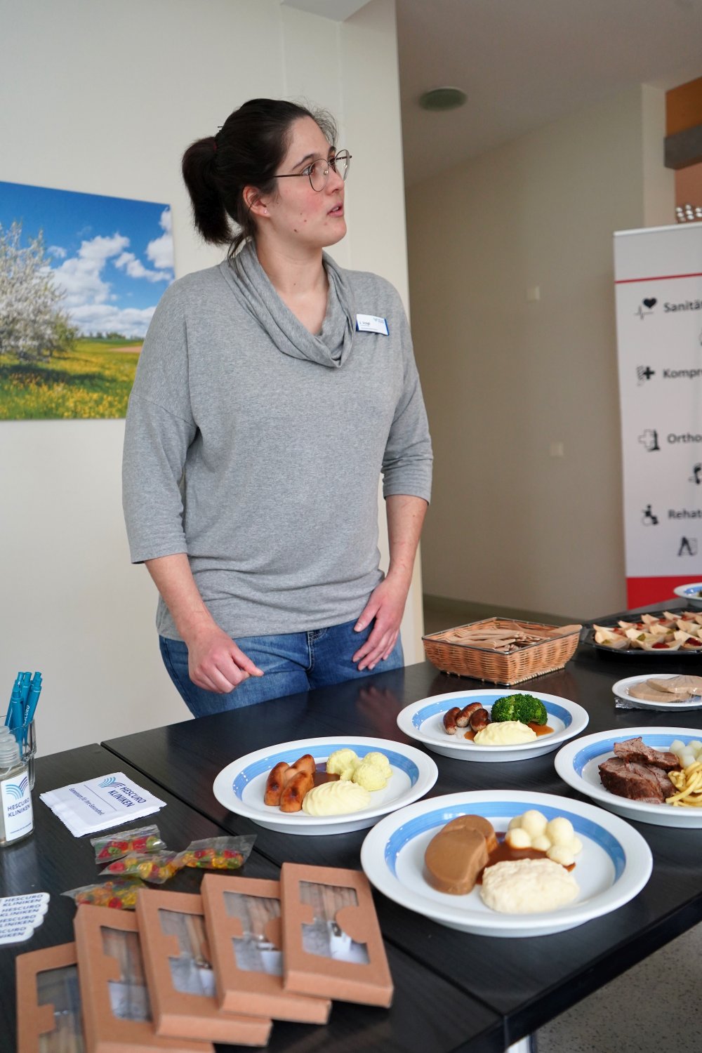 Wie Krankenhauskost zubereitet und angerichtet werden kann, das zeigten die Mitarbeitenden der Küche an ihrem Stand. Hier konnten die Besucher und Besucherinnen auch kleine Kostproben zu sich nehmen und waren beeindruckt von den vielfältigen Angeboten. Sehr anschaulich ging es für die Besucher und Besucherinnen in der Abteilung Physiotherapie zu. Hier durften sie in den sogenannten Alterssimulationsanzug schlüpfen und mit Unterstützung der Therapeuten einen Parcours bestehend aus Treppe, Matte und Luftkissen zurücklegen.