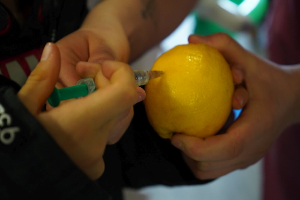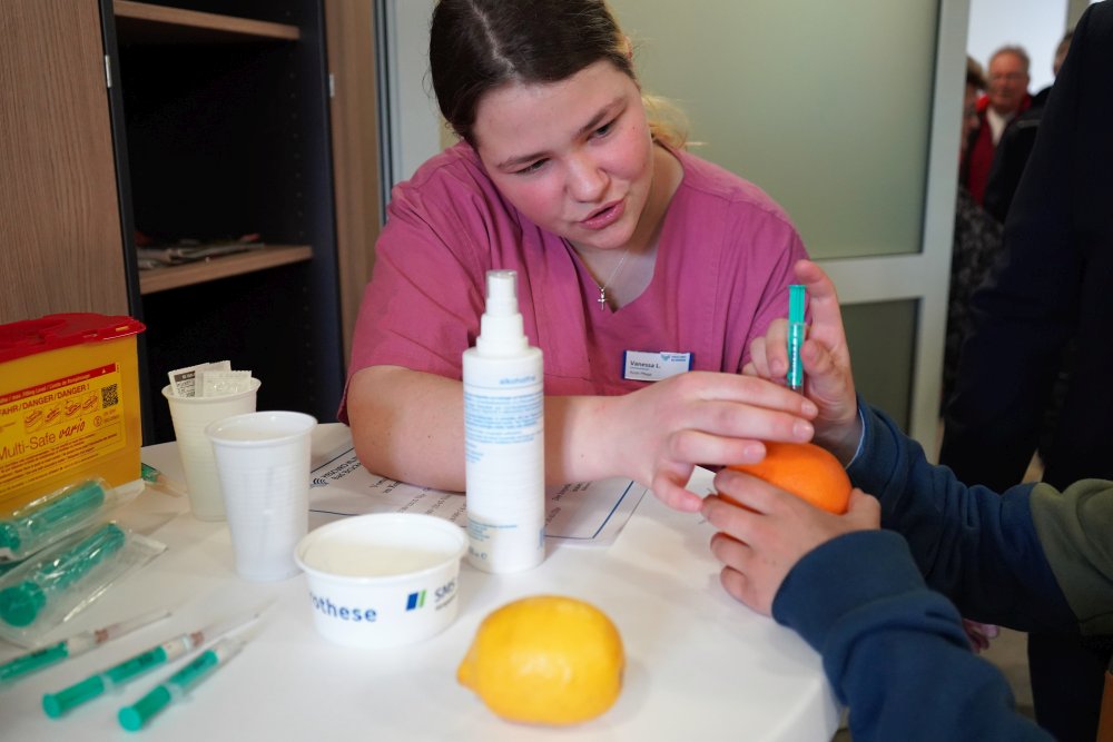Die angehenden Pflegekräfte, die Pflege-Azubis, vermittelten an ihrem Infostand das Gefühl für eine Injektion. „Das braucht man, um sich beispielsweise selbst in den Bauch zu spritzen“, erklärte eine der Auszubildenden. Hierfür durften die Besucher Kochsalzlösung in eine Zitrone oder Orange spritzen. Daneben stand ein Schwarzlichtgerät bereit, welches aufzeigte, wie gut die Besucher und Besucherinnen zuvor ihre Hände desinfiziert hatten.
