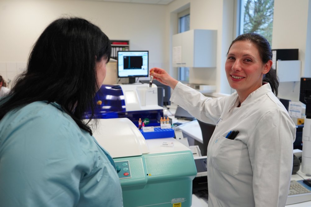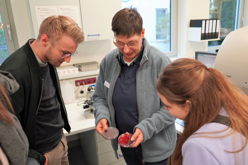 Im Labor erklärten die Mitarbeiterinnen nicht nur die Arbeitsschritte von der Blutentnahme bis zur Analyse. Sie zeigten auch, anhand welcher Faktoren Blutgruppen bestimmt und wie Bakterienkulturen angelegt werden. „Daraus können wir beispielsweise ableiten, welches Antibiotikum der Patient, die Patientin braucht“, erklärte Sandra Hornung von der Labororganisation. Interessierte durften auch durchs Mikroskop blicken, unter dem es ein Differenzialblutbild zu sehen gab.