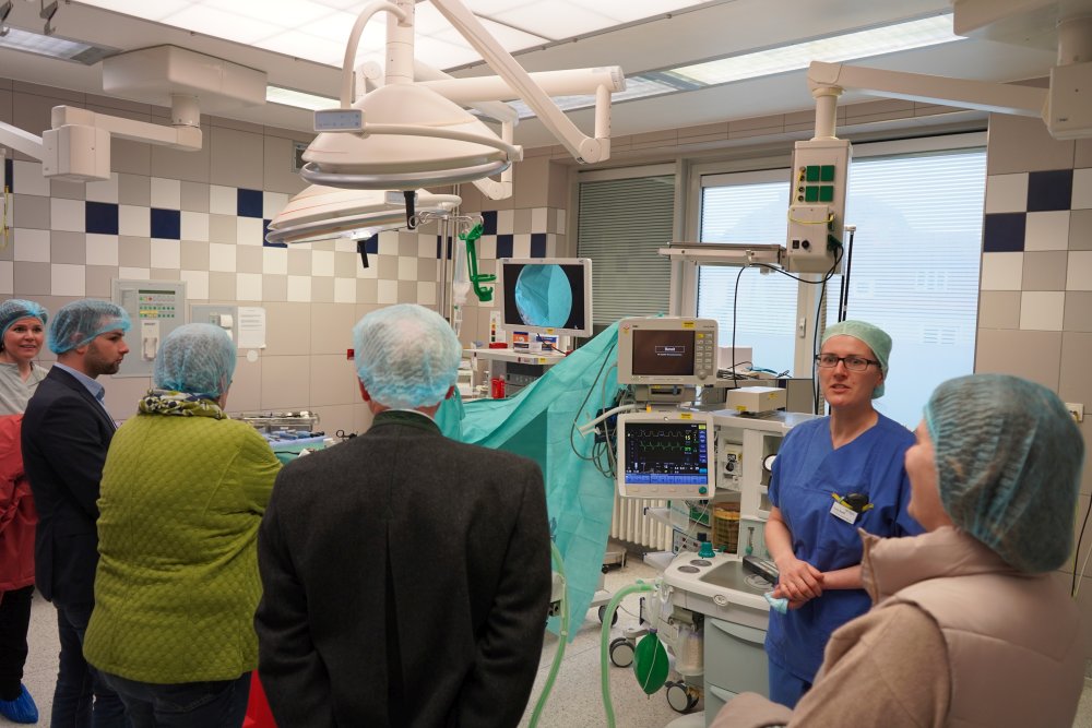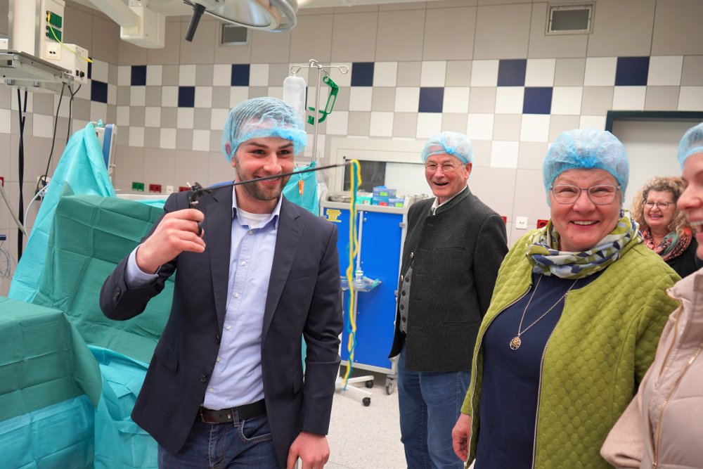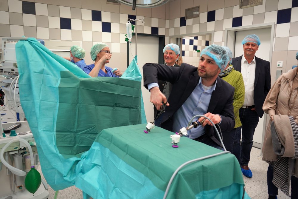 Wie lassen sich 25 bis 30 Zentimeter lange Gummibärchen-Schnüre minimalinvasiv aus einem OP-Dummie entfernen? Diese Aufgabe galt es im Operationsbereich zu lösen. Mit Begeisterung probierten dies viele Kinder und Erwachsene aus, so auch der Bad Brückenauer Stadtrat Claudio Kleinhenz. Das Gremium war am Samstag gemeinsam mit dem Bürgermeister Jochen Vogel eigentlich bei der Klausurtagung gebunden, nutzte aber die Mittagspause für einen Besuch mit Rundgang durch das Krankenhaus. Der führte auch in den OP, wo die Gummibärchen-Schnüre warteten. Einige wenige Bewegungen reichten aus und schon hatte Stadtrat Kleinhenz die blauen und gelben Schnüre mittels OP-Zange befreit. „Mir kam dabei meine Ausbildung als Werkzeugmacher zugute“, erklärte er seine Fingerfertigkeit, als seine Amtskollegen ihn für seine die erfolgreiche „OP“ lobten.